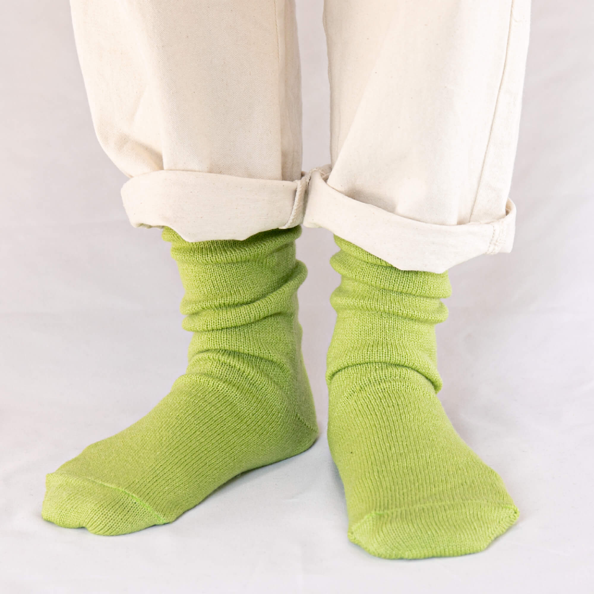 そして極限までゴムを緩くし、平編みで太めに編み上げているためずれにくく、締め付けも極力なくゆったりと履くことができます。