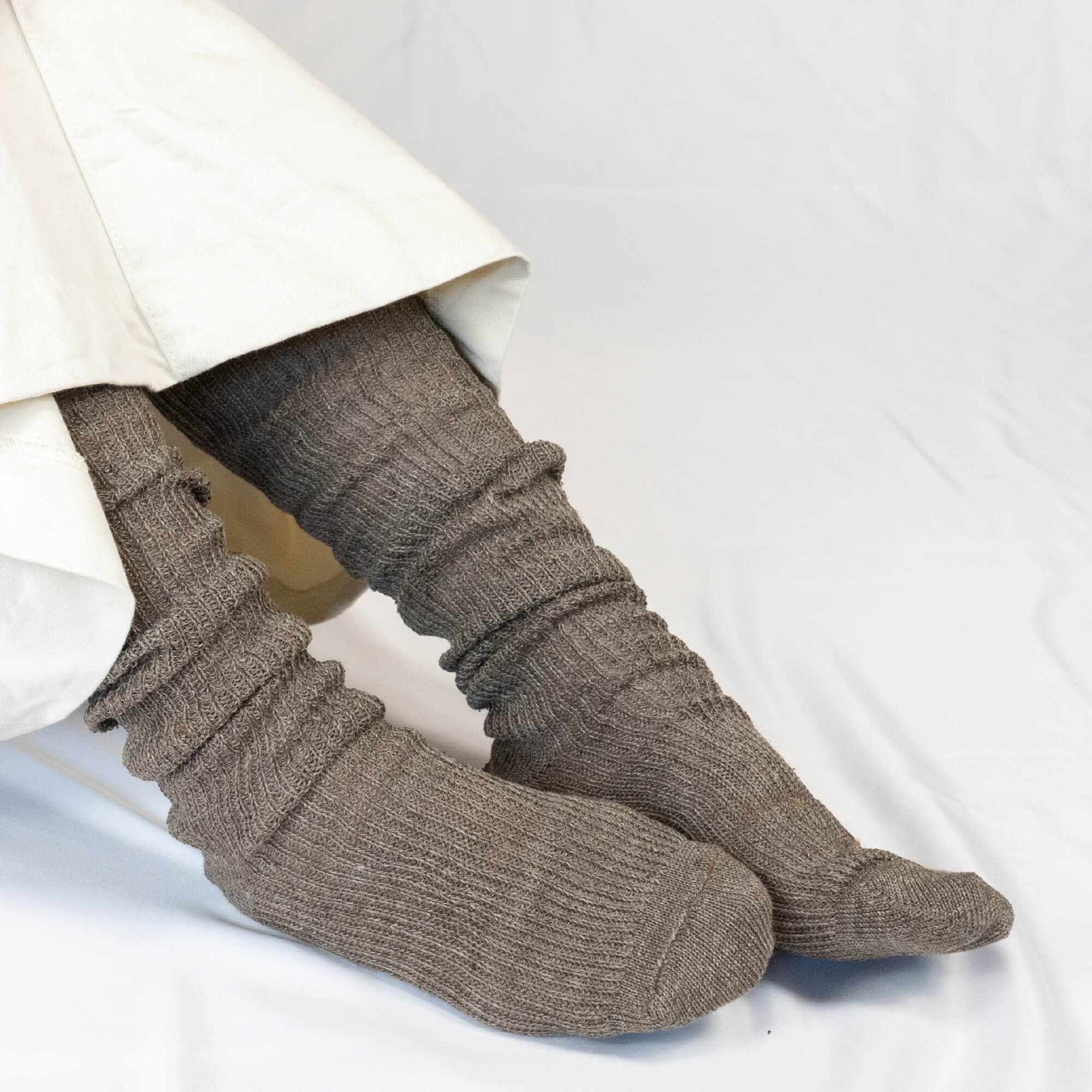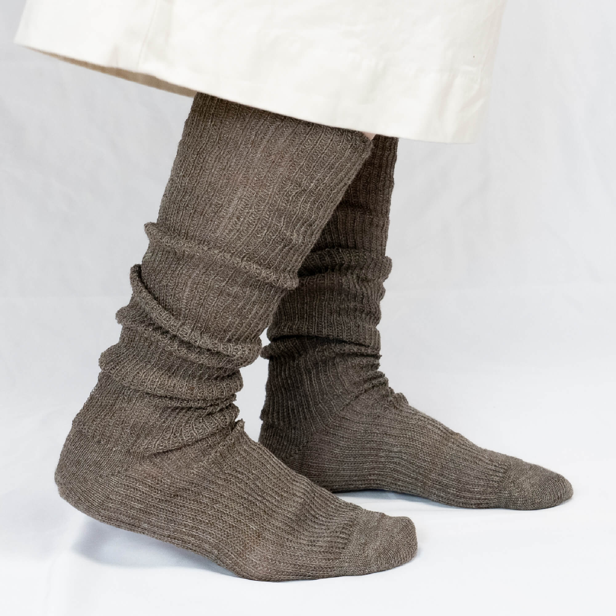 上質な麻のシャリ感と通気性も魅力のひとつです。リブ編みによって肌触りを柔らかく気持ちよく履いていただけます。