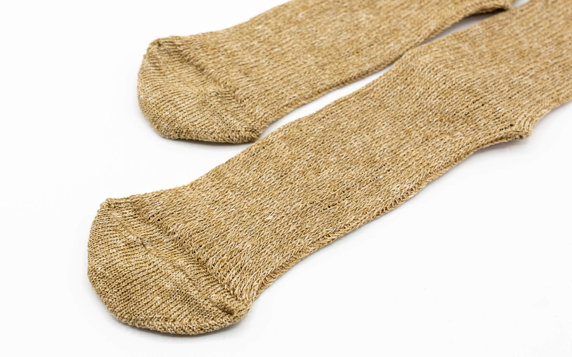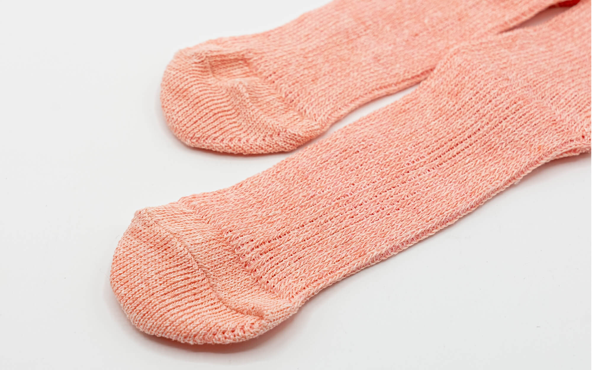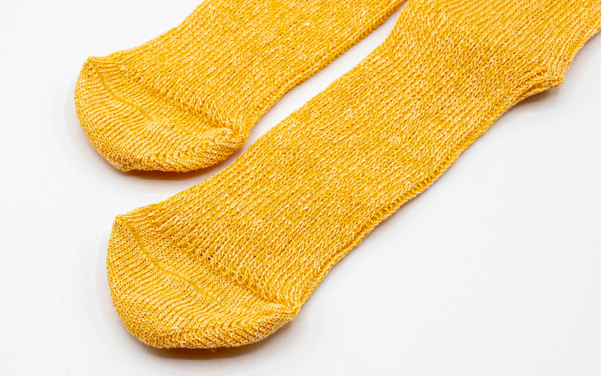 上質な麻のシャリ感と通気性も魅力ですが、リブ編みによって肌触りを柔らかく気持ちよく履いていただけます。